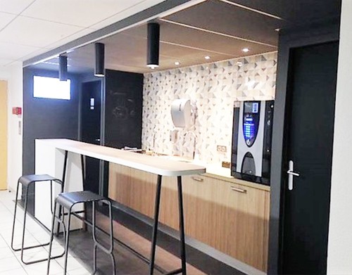 L'espace des cuisinettes était fermé, petit et de la place était perdue. Nous avons ouvert l'espace en poussant les portes des toilettes de chaque cotés. Nous avons descendu un plafond pour rendre l'espace intime et le détacher du couloir, nous avons dessiné un mobilier fonctionnel et aéré. Puis choisi des couleurs sobres et chaleureuses et quelques petites touches plus vives.